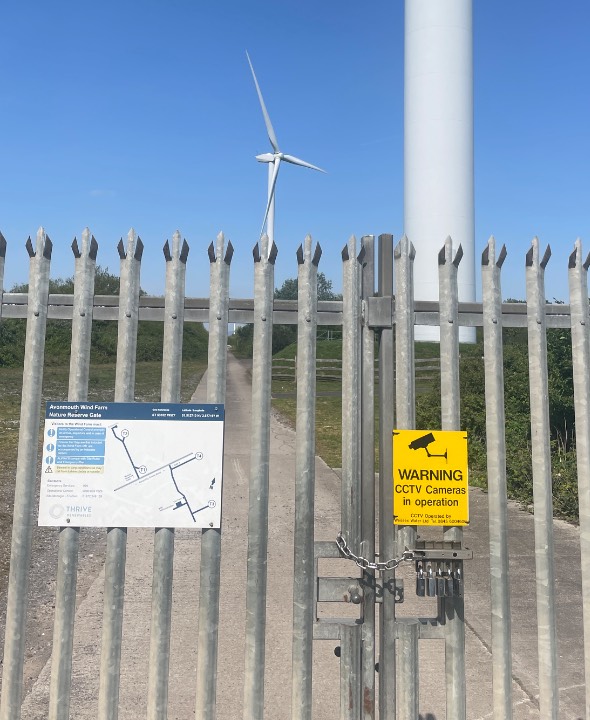 Look carefully and read that is says wind farm and nature reserve. What a lovely nature reserve! With its WARNING CCTV cameras in operation and 5 padlocks on the gate.